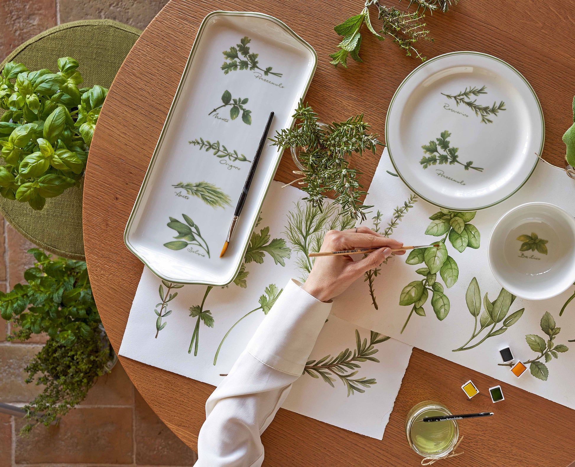 Il bianco candido della satin porcelain accoglie delicate erbe aromatiche in questa collezione indimenticabile, destinata al mondo della tavola e della cucina. Un decoro fatto a mano, all’insegna dell’artigianalità, sprigiona su ogni prodotto della collezione il profumo intenso di un orto rigoglioso.