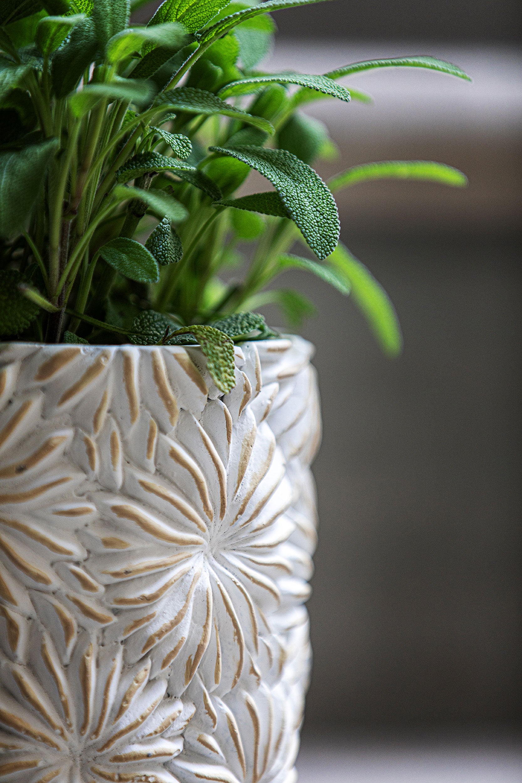 Frutti d'anice campeggiano in rilievo così chiaramente su questi cachepot materici che sembra possibile percepirne il profumo in casa.