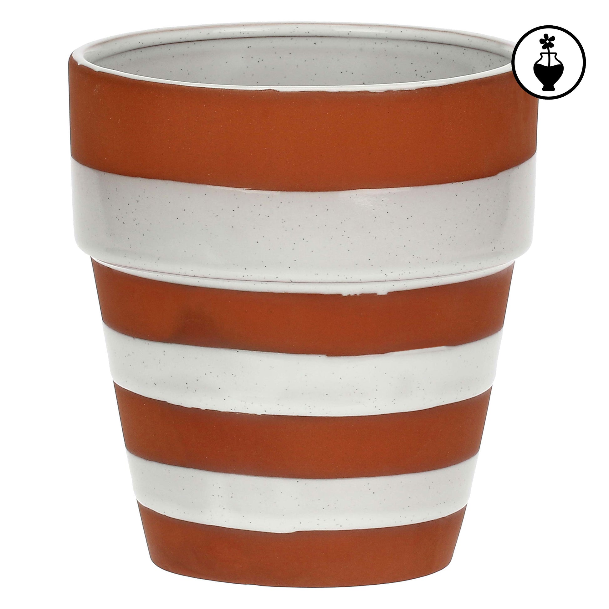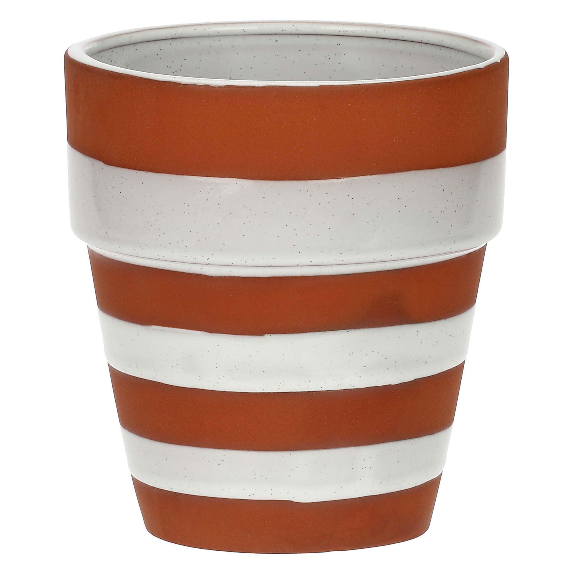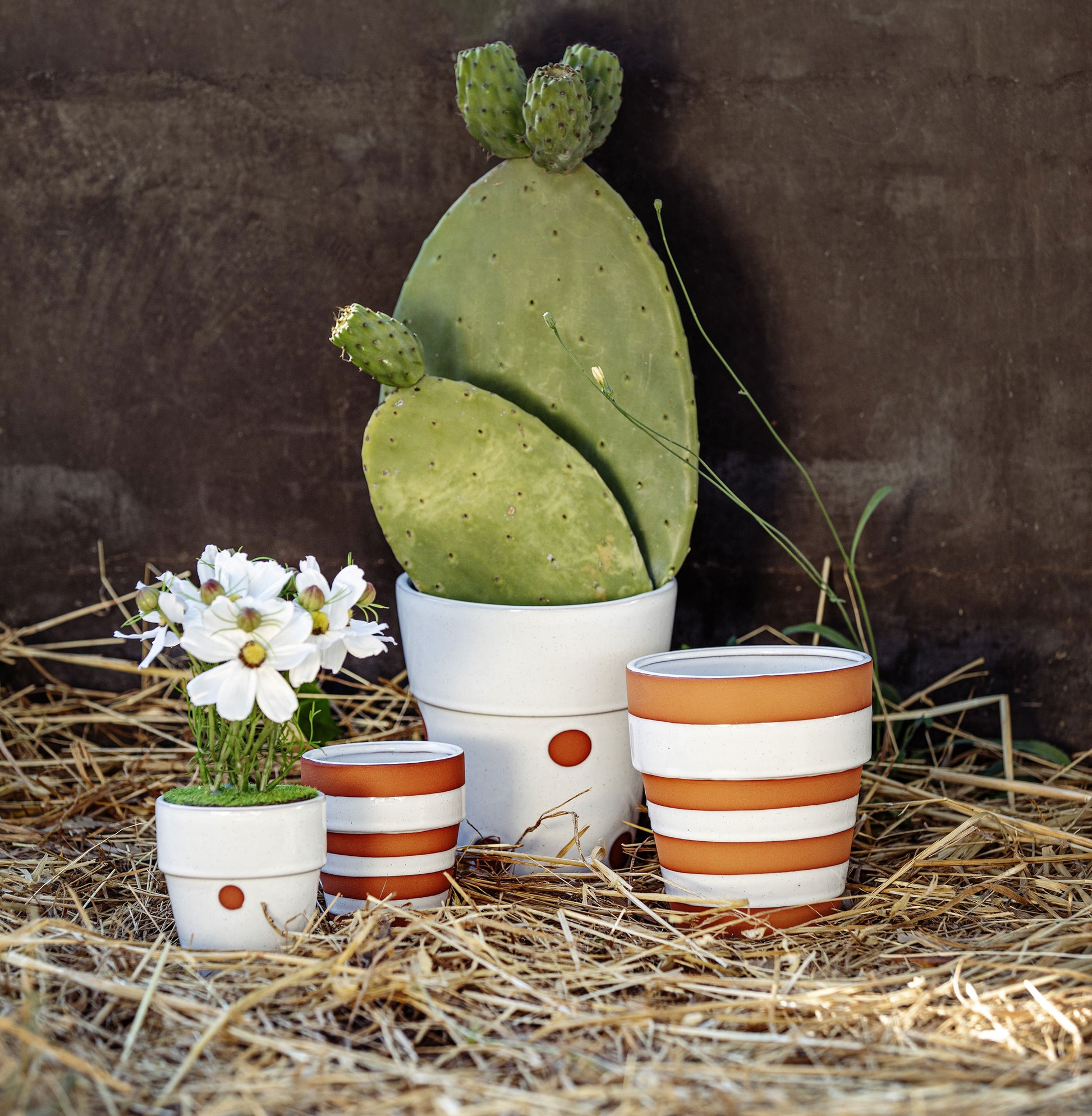 Un trend design che prende vita su vasi e cachepot che alternano al bianco il colore della terracotta, in una delicata sequenza di righe e pois.