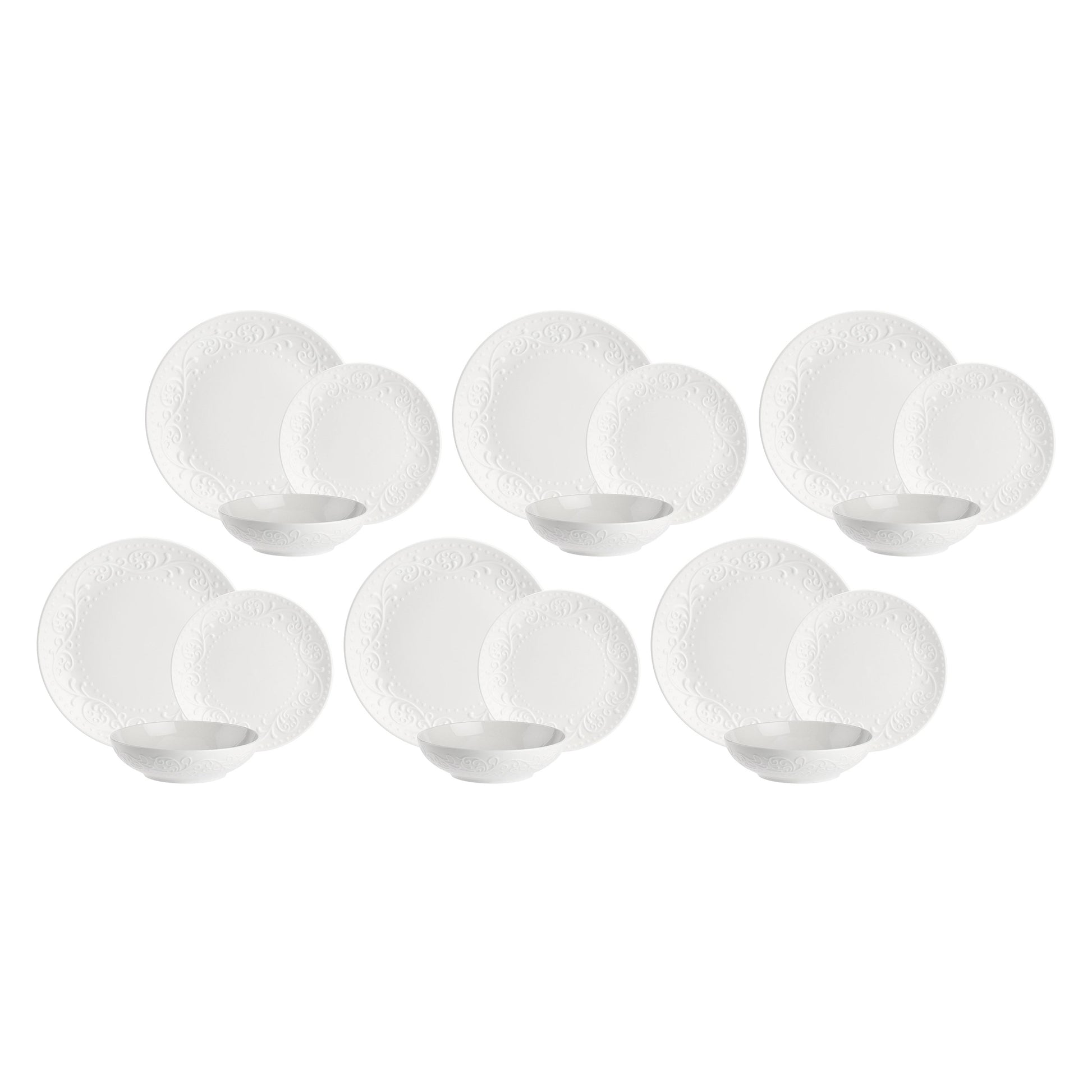 Set 18 pezzi Tavola, Sognante - New Bone China, Piatto Piano 28 cm; Piatto Fondo 20 cm; Piatto Frutta 21 cm