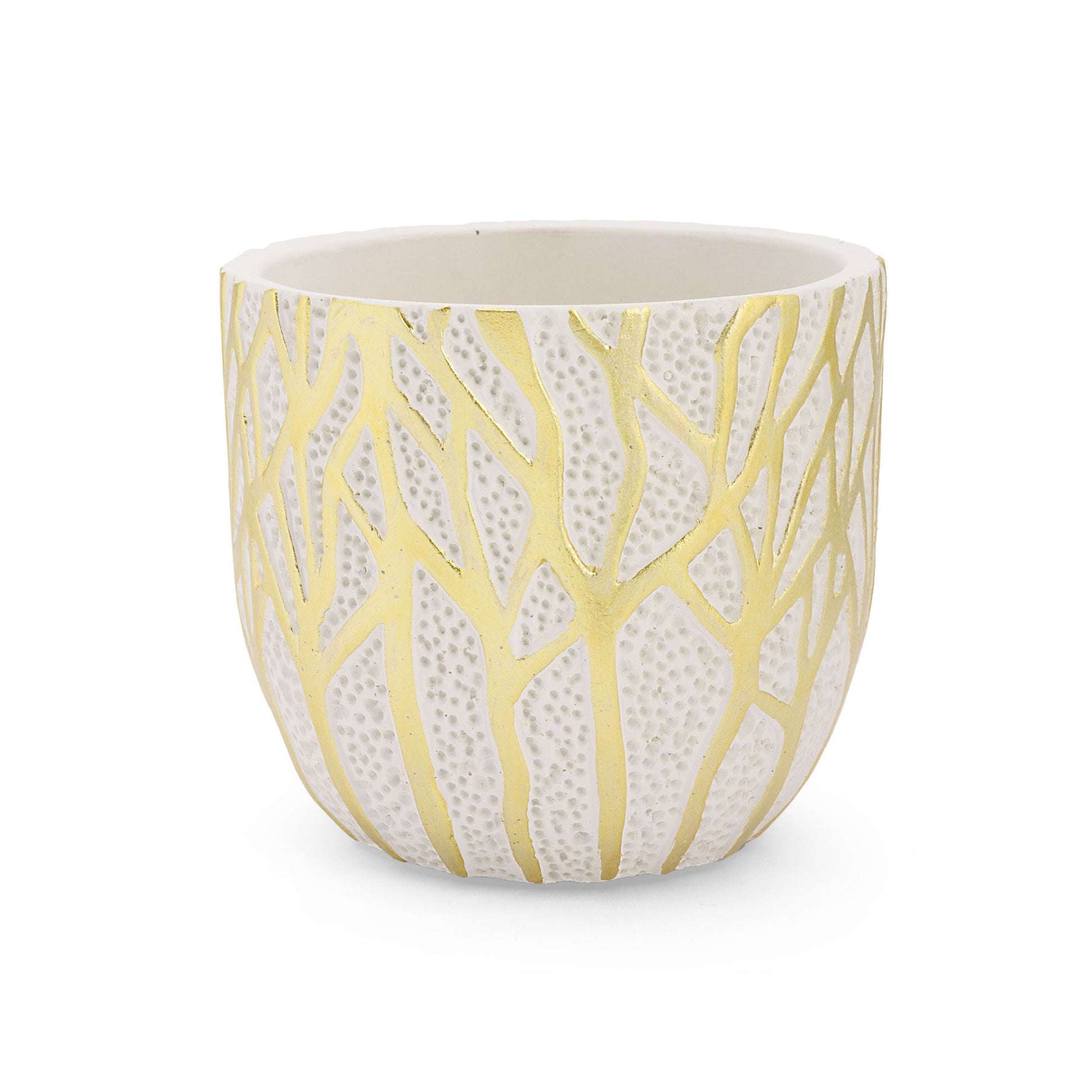 Cachepot di tendenza in cui venature dorate percorrono materiche superfici in una riproduzione di un sottobosco eclettico.